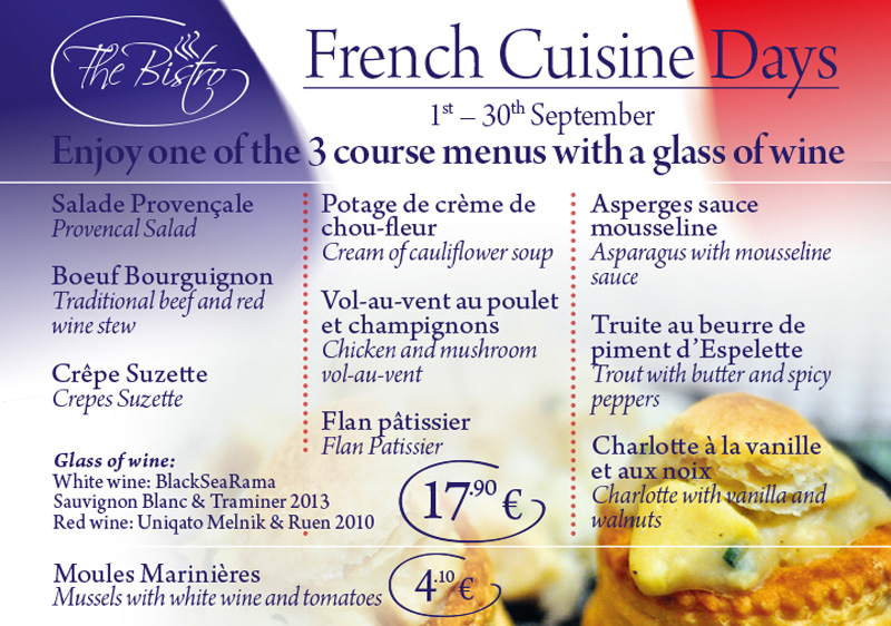 For a true French-style experience enjoy one of the three course menus with a glass of BlackSeaRama Sauvignon Blanc & Traminer 2013 white wine or Uniqato Melnik & Ruen 2010 red wine.