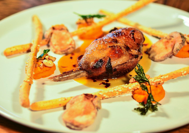 Chef Kirin recommends:  Duck leg with maple sauce with chili, carrot puree and sesame grissini with porcini mushroom