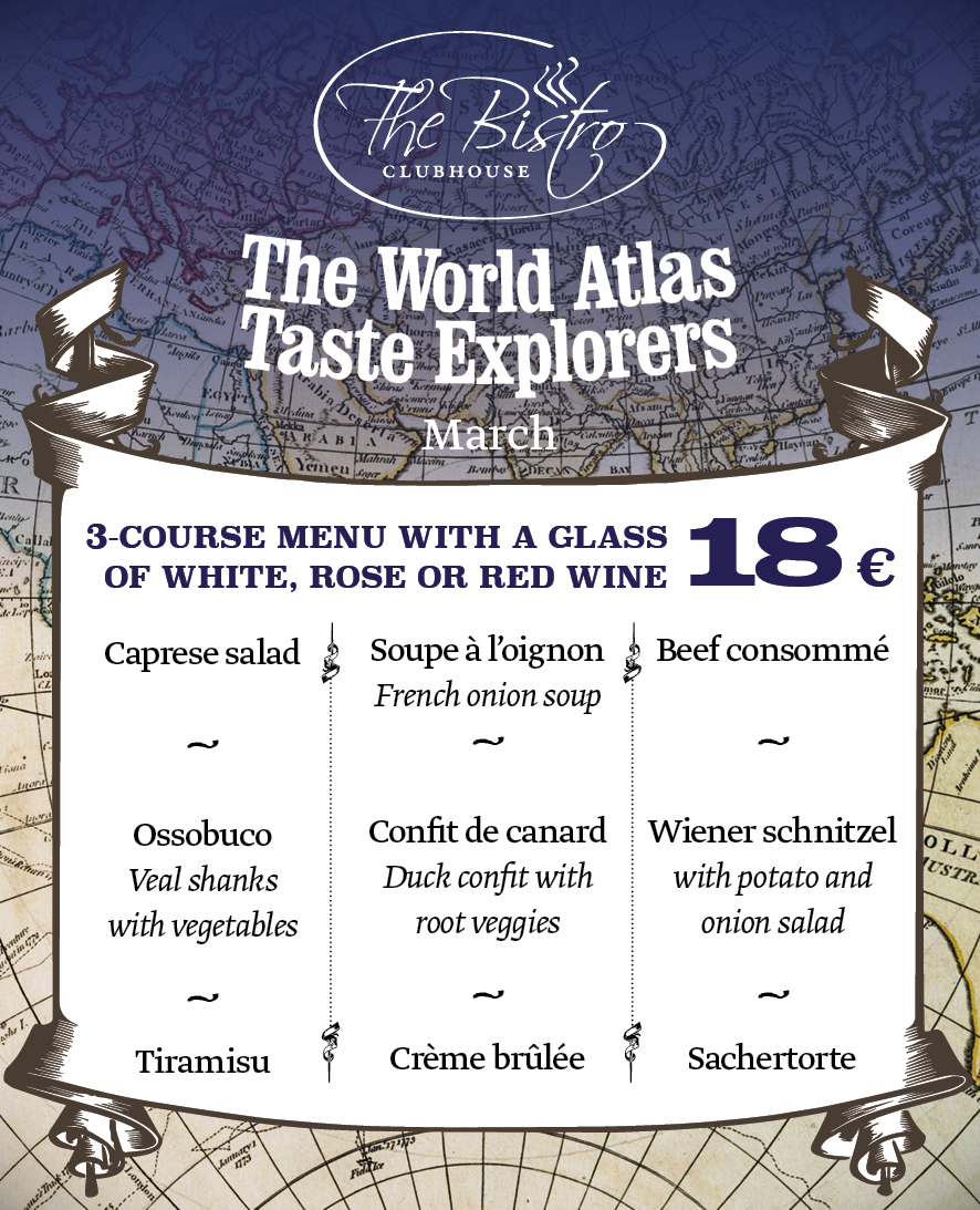 We give you some of the highlights of the season and the menu directions. But the only way to solve the puzzle is to visit the Club Bistro and enjoy a 3-course menu with a glass of wine for 18 €.